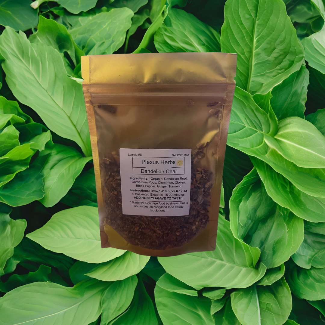Our Dandelion Chai Blend a hand-crafted herbal tea featuring dandelion root, cinnamon, cardamom, black peppercorns, ginger, cloves, and turmeric. This rich, spiced blend combines aromatic herbs for a delightful and warming tea experience, perfect for cozy moments any time of day.